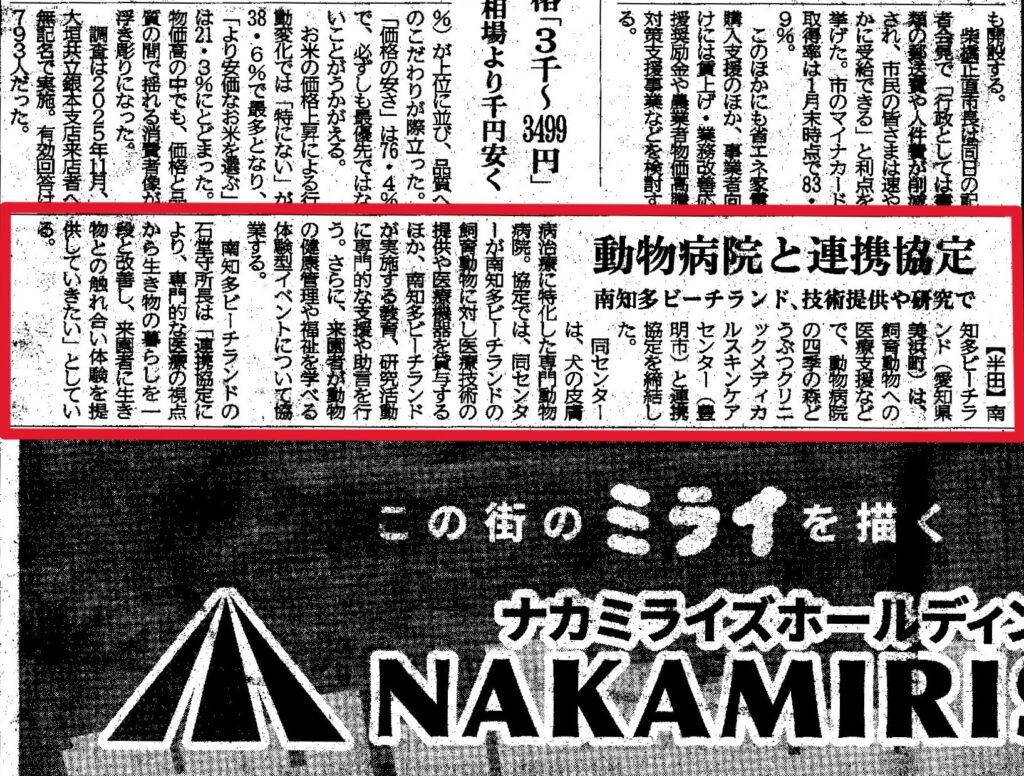 南知多ビーチランドと四季の森どうぶつクリニックの取り組みについての記事が掲載されました。